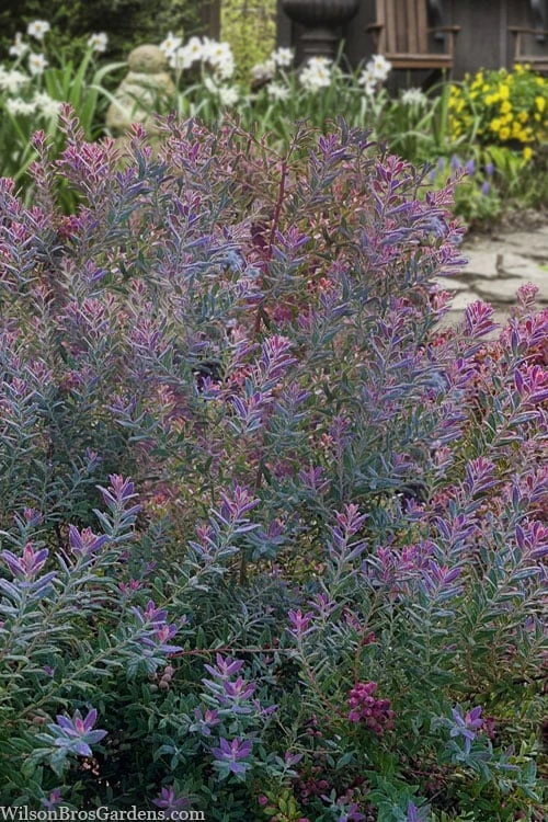 Here’s a colorful North American native evergreen shrub that pleases both the eyes and taste buds, making it an excellent choice for edible landscaping. In spring, bright purplish pink new leaves cover the 3 to 4 feet high and wide dense mound. In summer the leaves turn to a dusty blue-green with fall bringing shades of deep red and purple. An abundance of urn-shaped white to light pink flowers appear over a long period in spring developing into edible, sweet blue-black berries that can be picked and eaten right off the bush from late spring through summer. The berries are also great for use in making jams or preserves.
