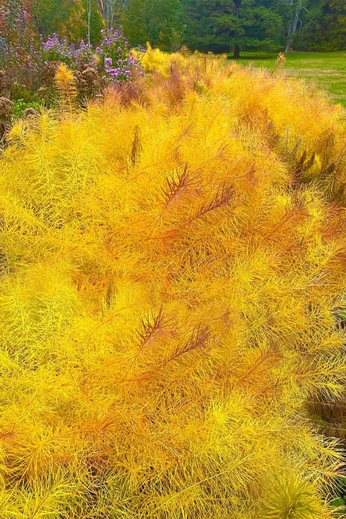 An easy-to-grow and beautiful North American native flowering perennial that won the 2011 Perennial Plant Association’s Plant of the Year Award, the Threadleaf Blue Star, Amsonia hubrichtii, provides three season interest in the garden. In spring, the needle-like deep green foliage has a soft, feathery appearance that is sure to attract attention. In spring to early summer, abundant clusters packed with pretty, star-shaped, sky-blue flowers crown plants at the top of every stem attracting both visual attention and the butterflies. But one of this plants most attractive features is the bright and rich golden-yellow fall foliage, which is something we always look forward to seeing in our gardens.